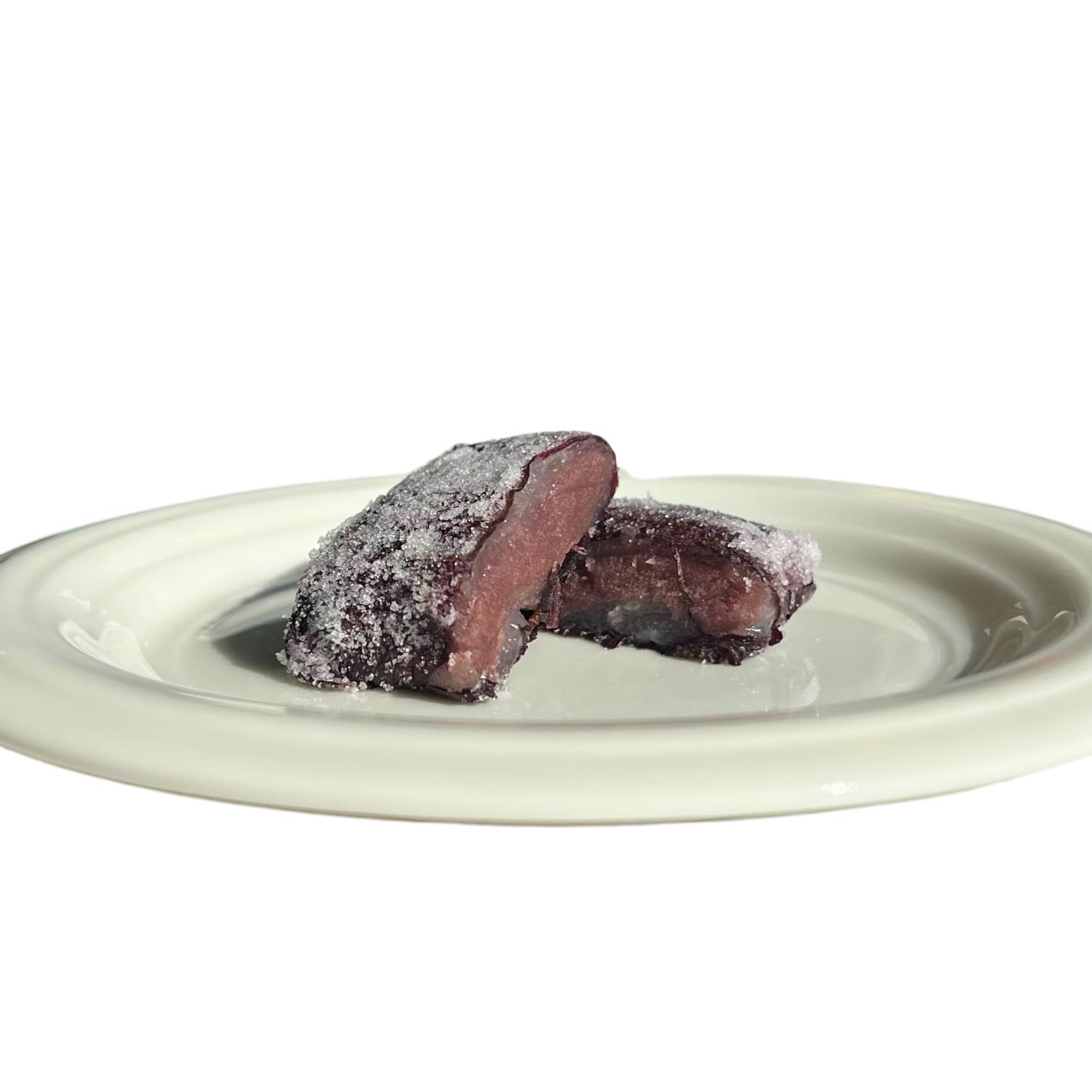 金木町の銘菓「甘露梅」は、黒あんと求肥(ぎゅうひ)を赤紫蘇の葉で包んだ伝統的な和菓子です。赤紫蘇の爽やかな香りと程よい塩味が、上品な甘さの黒あんと求肥の柔らかな食感と絶妙に調和しています。